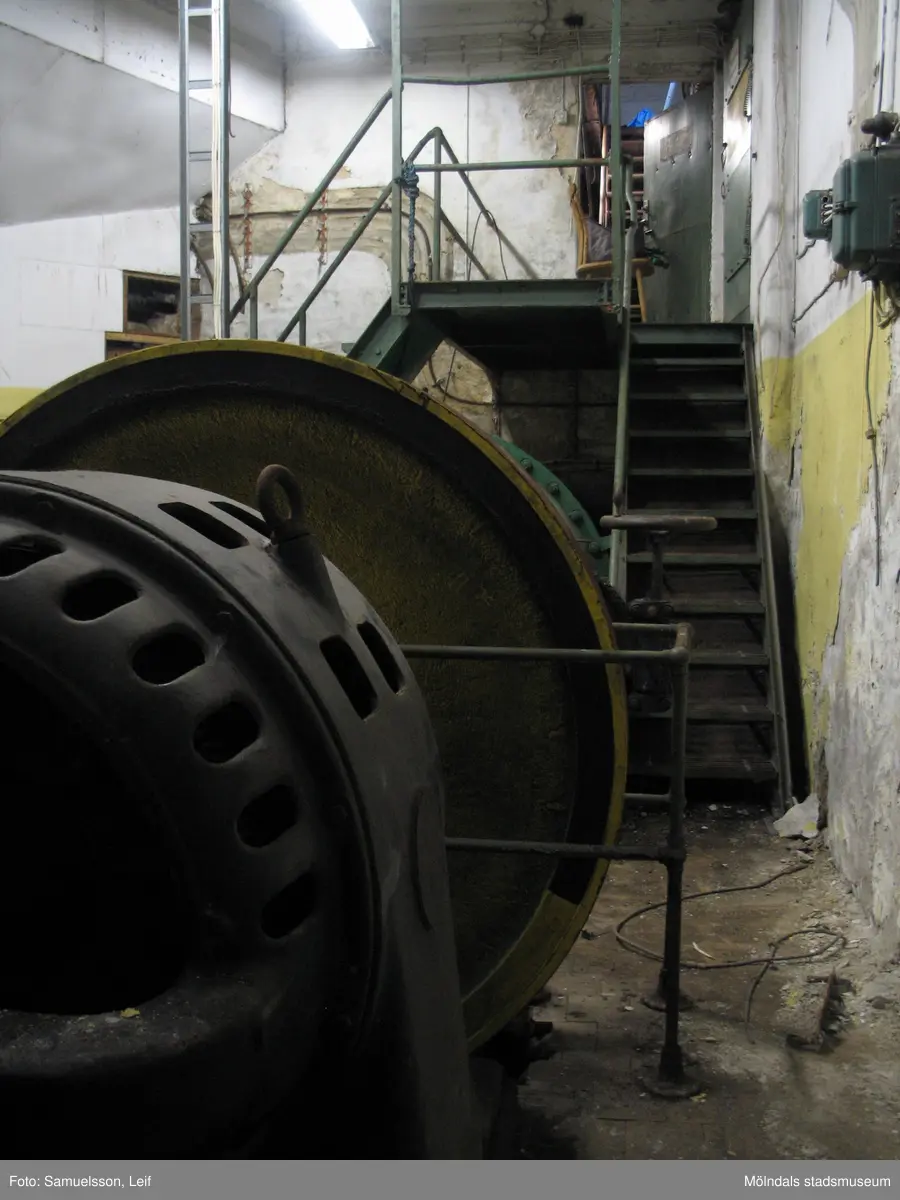Utrymme med en elektrisk motor. I bakgrunden leder en trappa upp till en halvöppen dörr. Interiörfotografi från byggnad vid Soabs industrianläggning i Mölndals Kvarnby, år 2007. Anläggningen användes vid fototillfället av Hexion Speciality Chemicals Sweden AB.