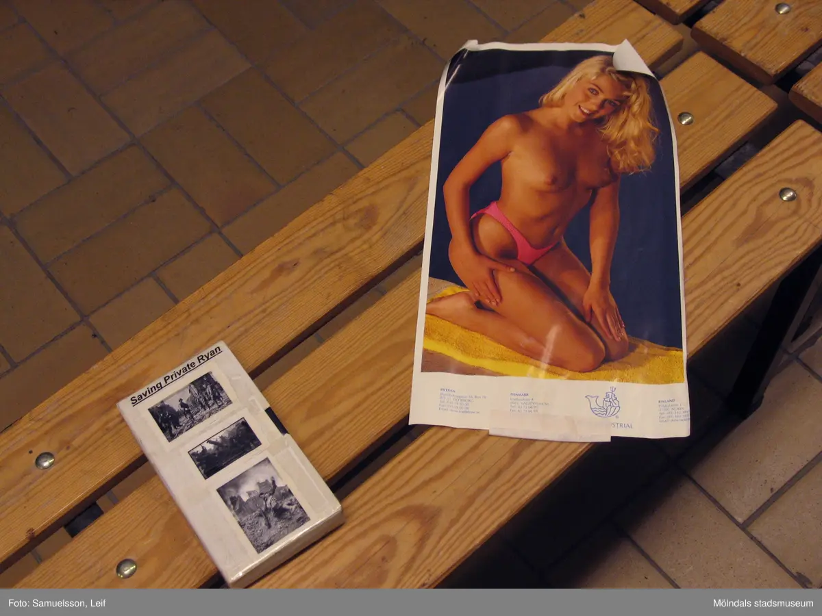 Sittbänk i ett omklädningsrum. På bänken ligger ett filmfodral till filmen Saving Private Ryan samt en bild på en lättklädd kvinna. Interiörfotografi från byggnad vid Soabs industrianläggning i Mölndals Kvarnby, år 2007. Anläggningen användes vid fototillfället av Hexion Speciality Chemicals Sweden AB.