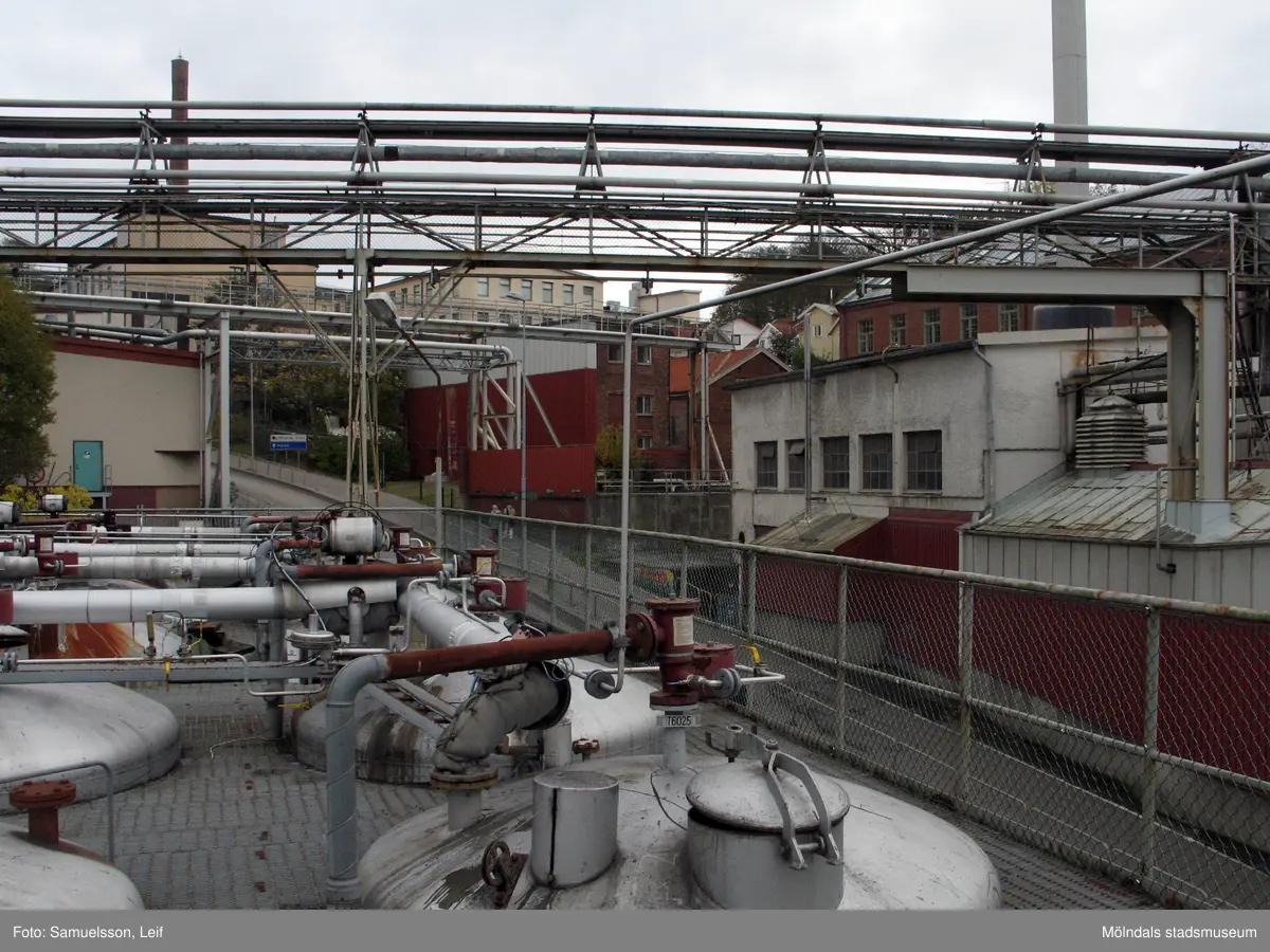 Titel: Byggnader vid Soabs industrianläggning på båda sidor om "Kråkan" (Kvarnbygatan) i Mölndals Kvarnby, år 2007. Anläggningen användes vid fototillfället av Hexion Speciality Chemicals Sweden AB.