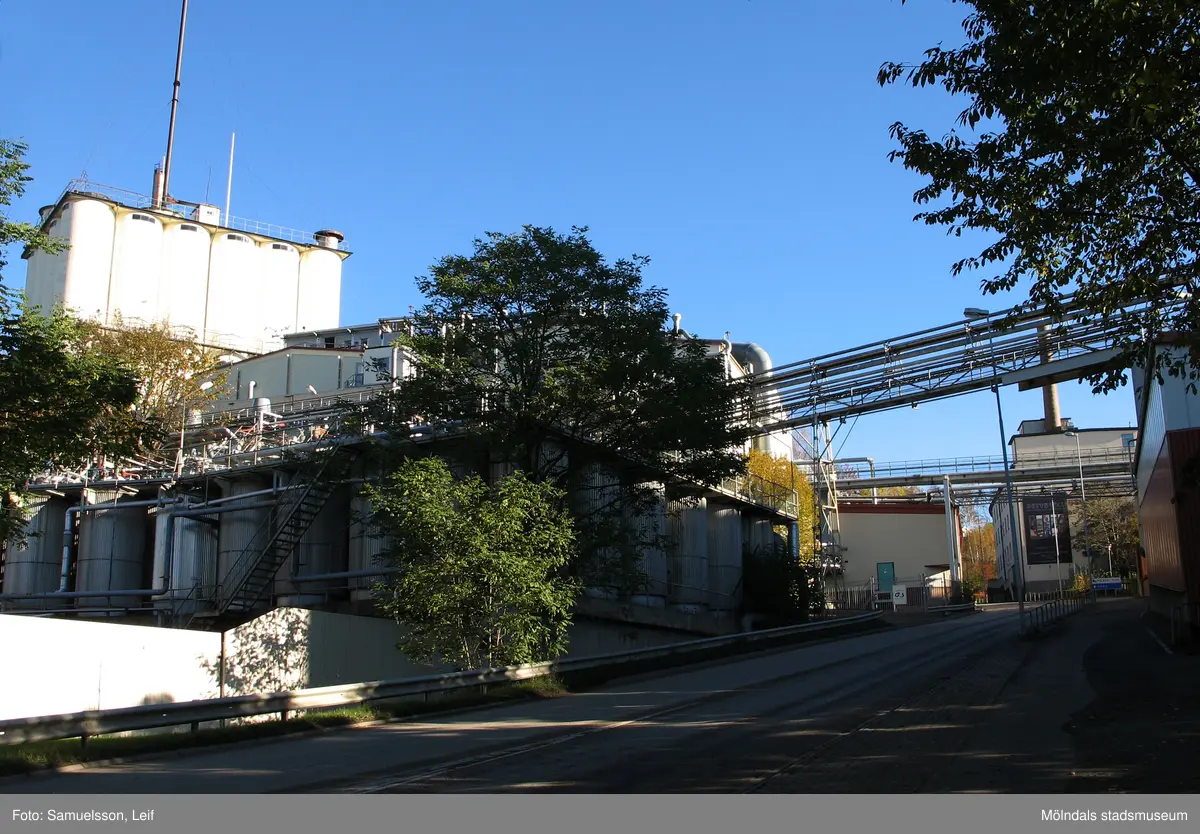 Vy från "Kråkan", Kvarnbygatan, mot byggnader vid Soabs industrianläggning i Mölndals Kvarnby, år 2007. Anläggningen användes vid fototillfället av Hexion Speciality Chemicals Sweden AB.