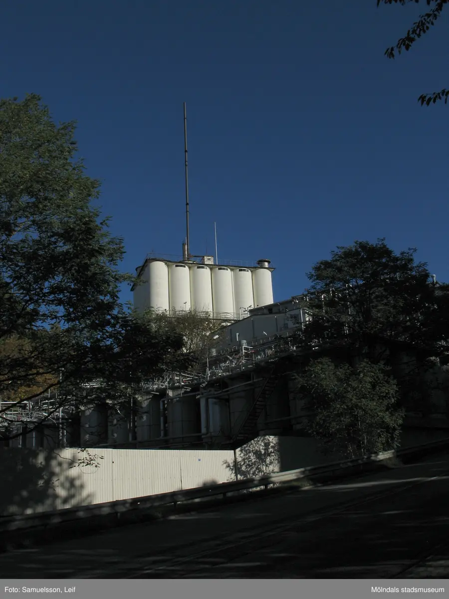 Vy från "Kråkan", Kvarnbygatan, mot byggnader vid Soabs industrianläggning i Mölndals Kvarnby, år 2007. Anläggningen användes vid fototillfället av Hexion Speciality Chemicals Sweden AB.