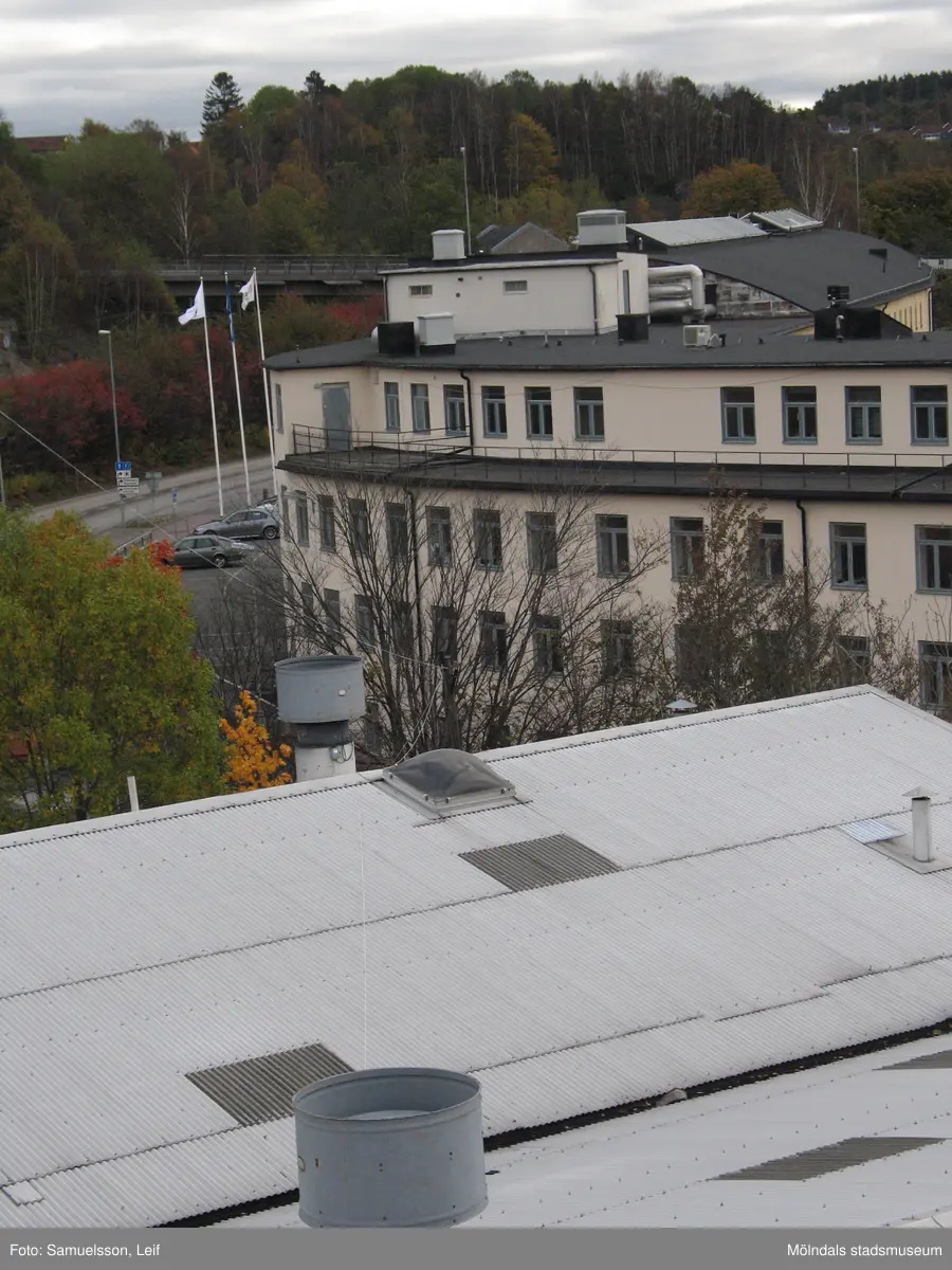 Vy mot Kvarnbygatan och byggnaden "Strumpan" från byggnad vid Soabs industrianläggning i Mölndals Kvarnby, år 2007. Anläggningen användes vid fototillfället av Hexion Speciality Chemicals Sweden AB.