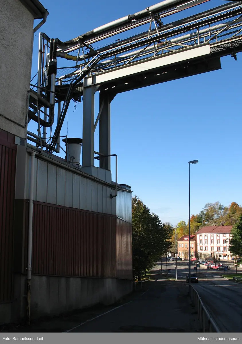 Vy från "Kråkan", Kvarnbygatan, mot Gamla torget. Till vänster byggnad vid Soabs industrianläggning i Mölndals Kvarnby, år 2007. Anläggningen användes vid fototillfället av Hexion Speciality Chemicals Sweden AB.