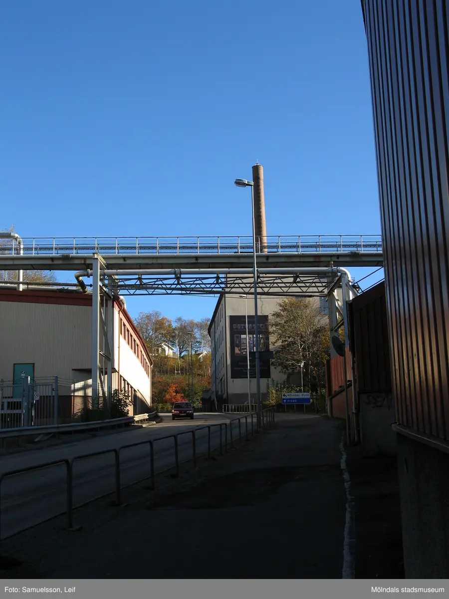 Byggnader vid Soabs industrianläggning på båda sidor om "Kråkan", Kvarnbygatan, i Mölndals Kvarnby, år 2007. Anläggningen användes vid fototillfället av Hexion Speciality Chemicals Sweden AB.