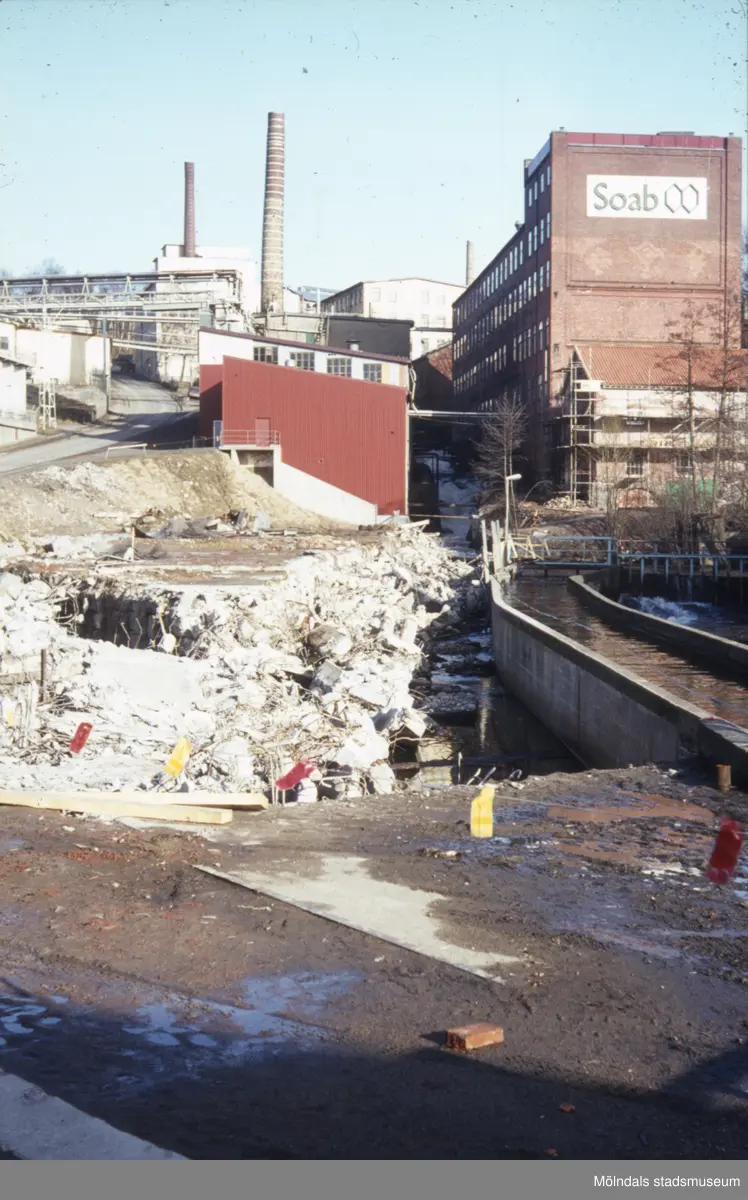 Vy från Forsebron över Kvarnfallets vattenränna samt rester efter rivningsarbeten av, troligtvis en byggnad tillhörande SOAB påKvarnbygatan 6, 1970-tal. Till vänster ses Kvarnbygatan och Soabs industriområde. Rakt fram, uppifrån, ses "Strumpan" (Kvarnbygatan 10-14) och Ahlafors textilindustri (Carlsberg). Till höger Soabs kontor (röd byggnad, senare Stora Götafors) på Götaforsliden.