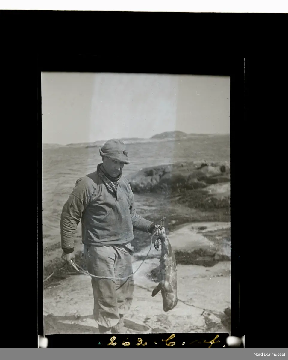 En man står på en klippa vid havet med sin fångst, en liten säl.