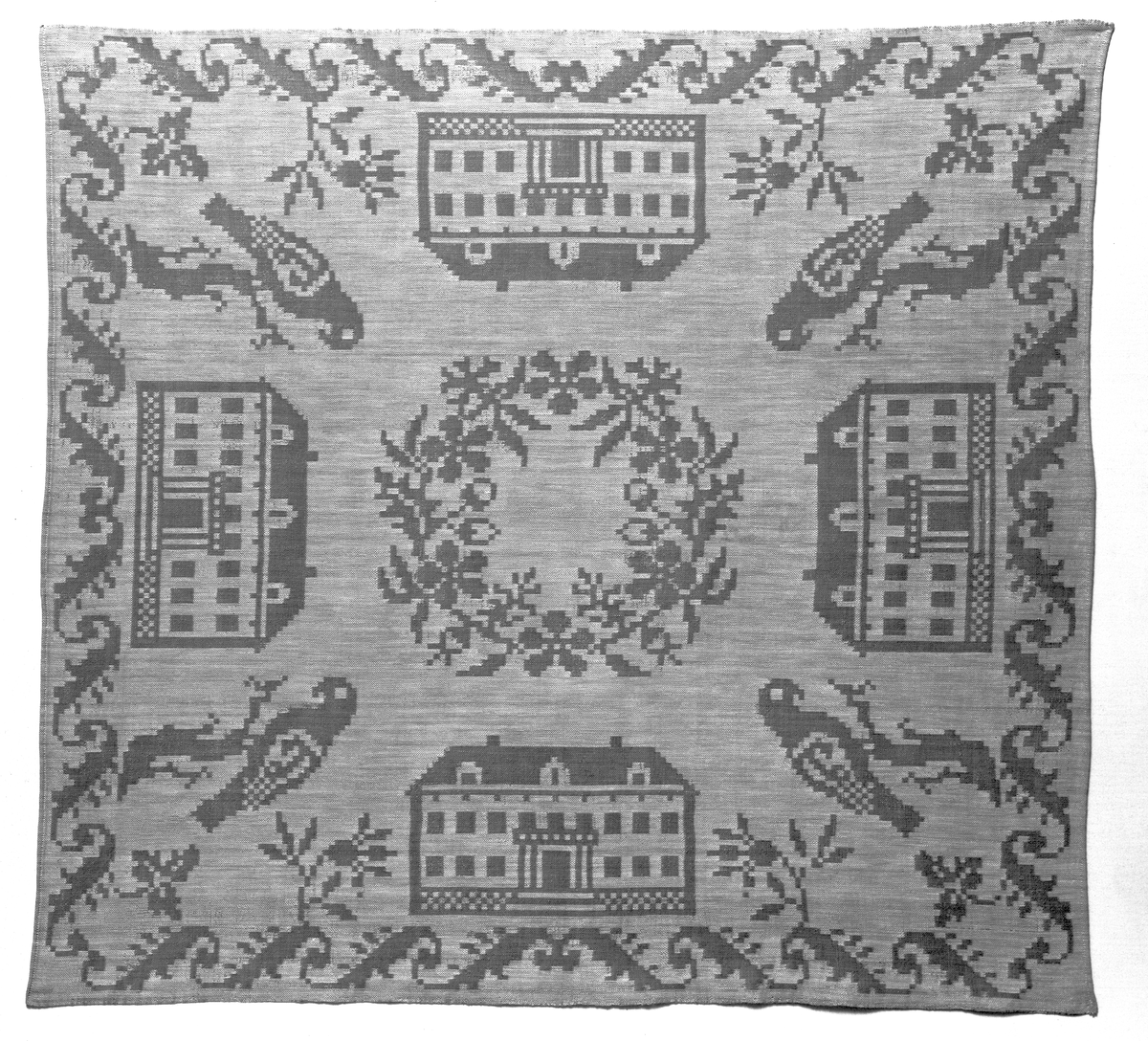 Titel: Duk i bomullsdamast med mönster hämtat ur Afhandling om drällers och dubbla golfmattors tillverkning, med begagnande af harnesk-rustning / författad af J.E. Ekenmark och systrar, Stockholm, 1928. Johan Erik (1786-1833), Hedda Christina ( 1786-1833), Lovisa Maria (1795-) och Gustava Fredrika, gift Beckvall (1800-). Troligen vävd av fru Ebba Brohäll, född Larsson, (1887-1957) som i sin ungdom arbetade som vävlärarinna på Tyfts folkhögskola på Tjörn. Hon var utbildad bl. a. på Borås Vävskola. Duken i privat ägo.
