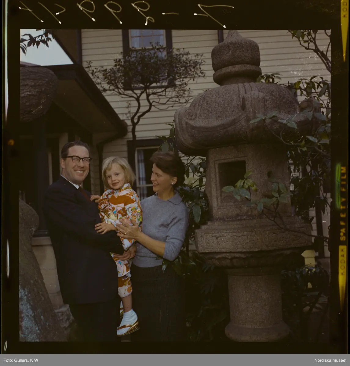 585/8 Facit Tokyo Daberg. En familj står i en trädgård vid en japansk lykta av sten. Barnet är klädd i kimono.