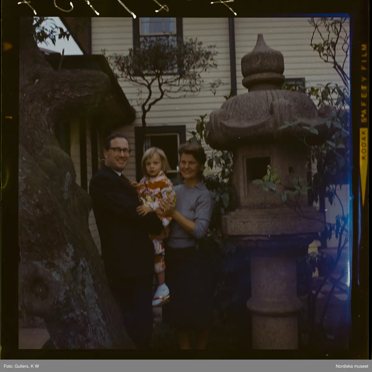 585/8 Facit Tokyo Daberg. En familj står i en trädgård vid en japansk lykta av sten. Barnet är klädd i kimono.
