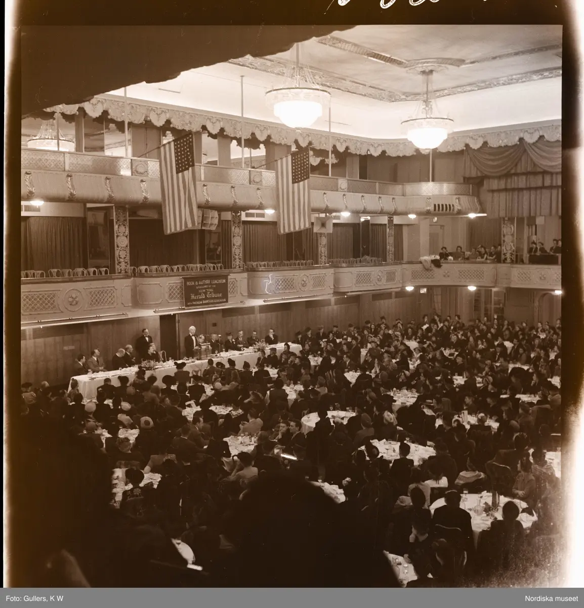 Titel: 1690 New York allmänt (N.Y. Herald Tribune). Publik vid Herald Tribunes bok- och författar-lunch lyssnar på ett anförande.