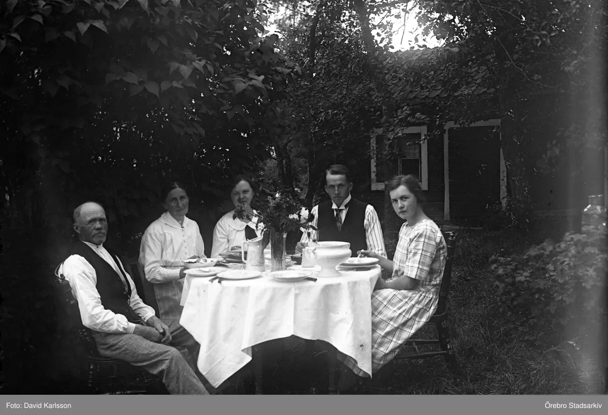 Familjen Karlsson vid middagsbordet i trädgården i Karlstorp, 1930-tal