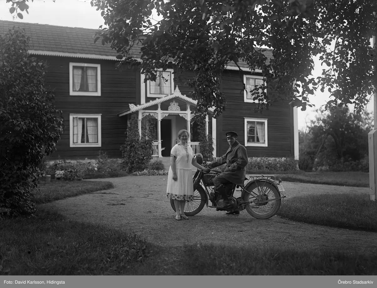 Linus med hustru Anna Karlsson samt motorcykel framför hemmet Karlstorp, 1930-tal