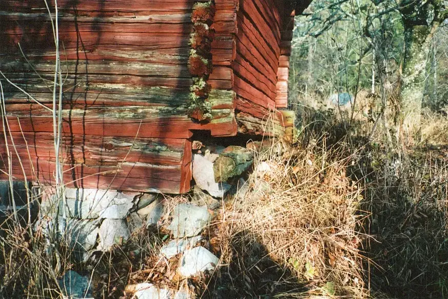 Kalvande timmerväggar på Roslags-Kulla hembygdsgård.