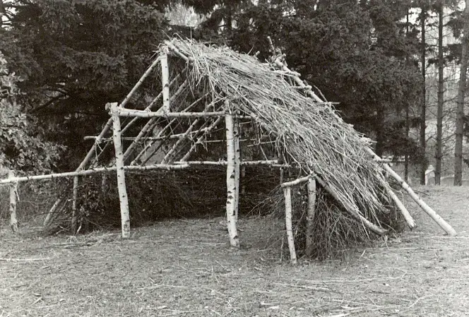 Titel: Järnåldersläger arrangerat för skolbarn vid Hågelby gård i Botkyrka november 1981.