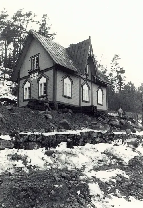 Hembygdsgårdar. Flyttning av Ingarö hembygdsmuseum vintern 1988.