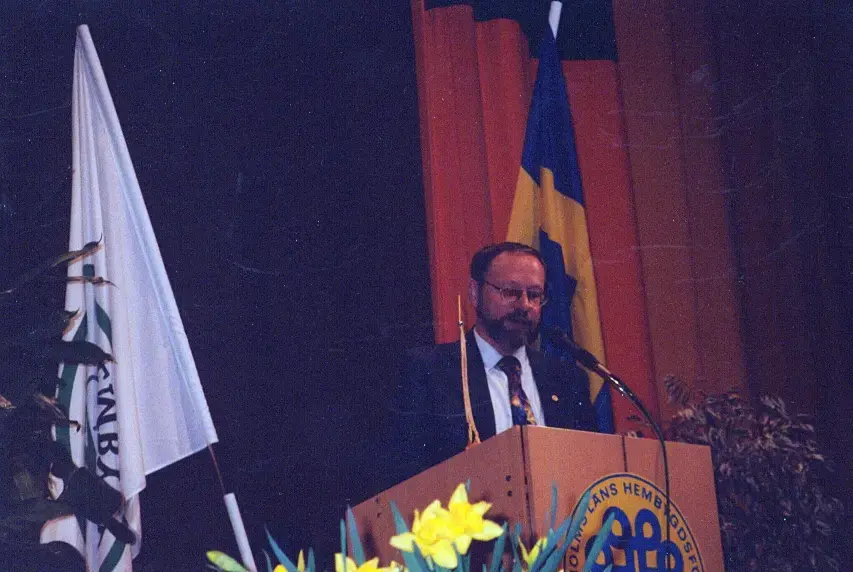 Kjell Nilsson presenterar årets diplommottagre Sven-Olof Garland med fru, Christina Murra, Sven Elf, Maya Falck, Gertrud Hillgren, Rolf Brate.