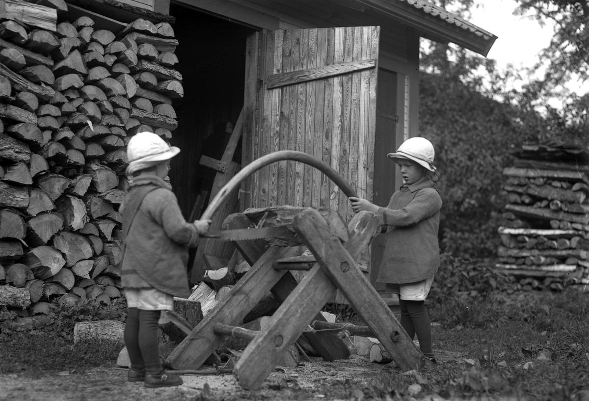 Olle och Pelle Carlsson sågar ved
