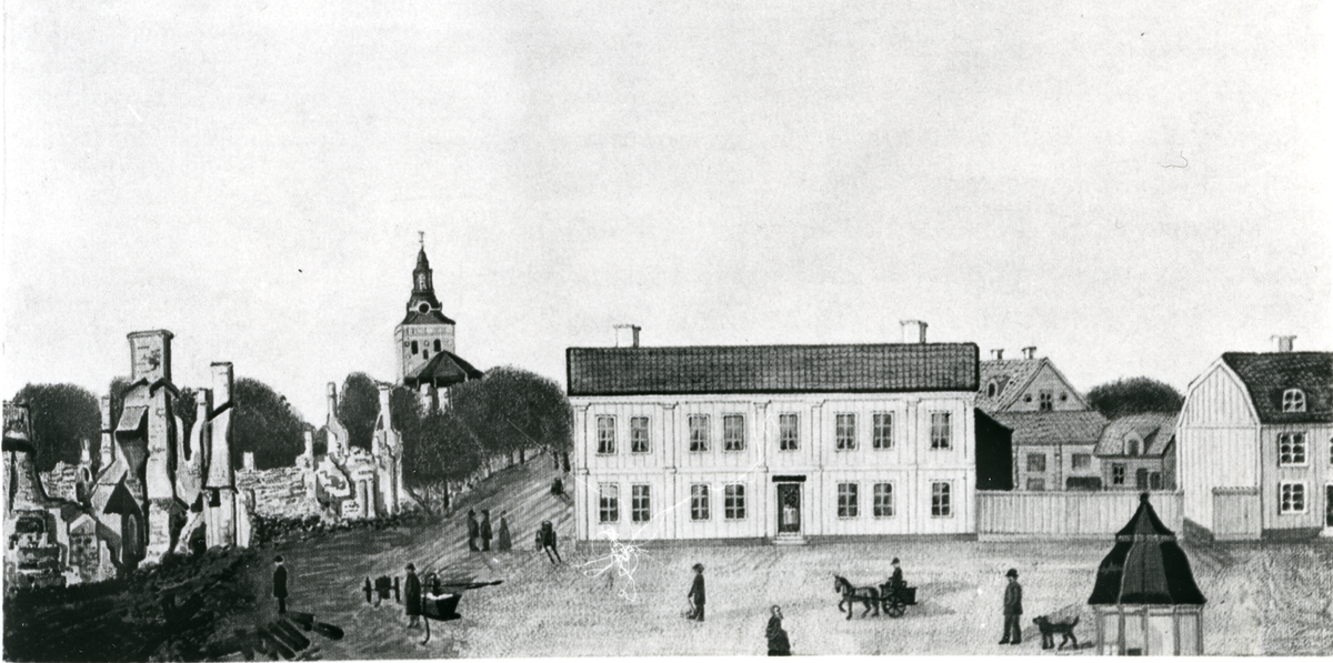 Från akvarell föreställande kvarteret Konstmästaren efter branden.