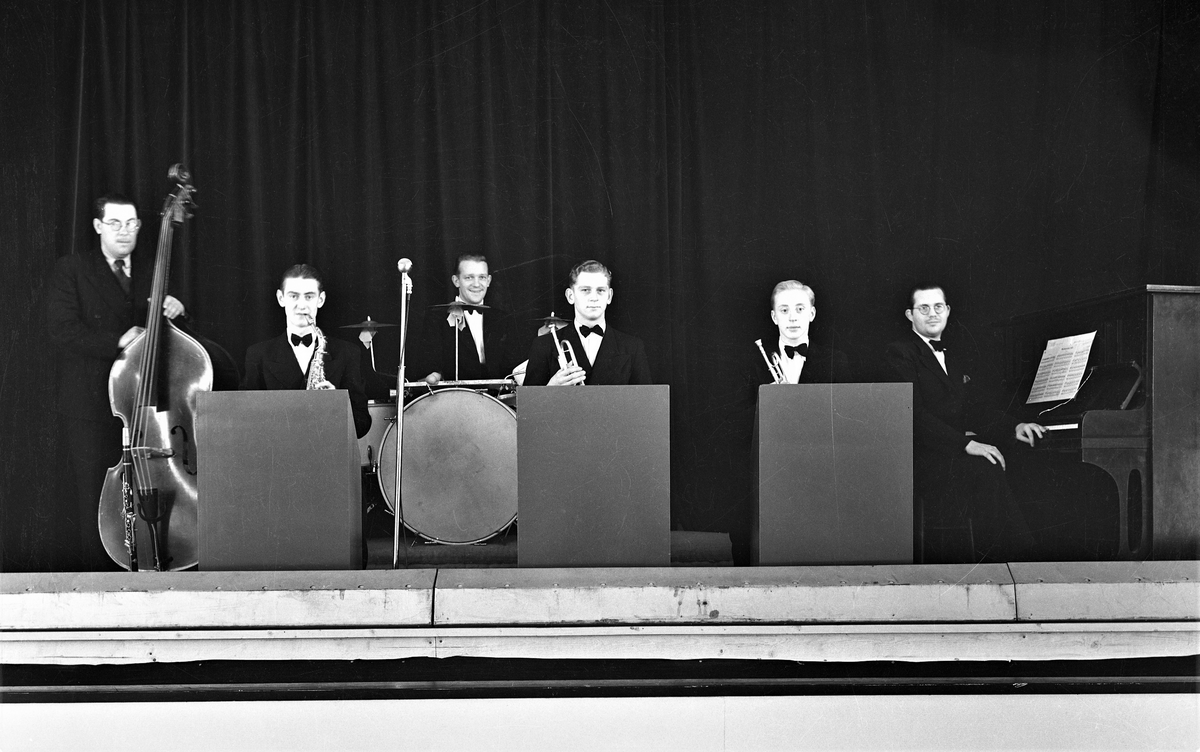 Okänd orkester, en sextett, på Stadshotellets scen i Varberg. Blåsarna sitter bakom pulpeter med trumslagaren bakom, kontrabasisten till vänster och pianisten till höger. (Se även bild nr GB2_4011)