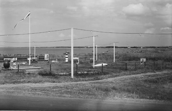 Vy mot Glommens Minigolfbana. I bakgrunden strand och havsvik.