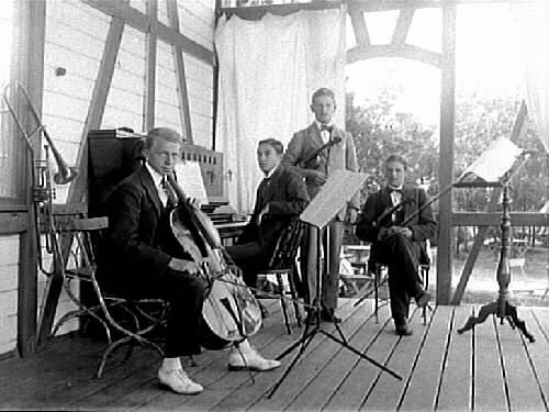 Orkester år 1919 på verandan till paviljongen på Gamla Påskberget. De spelar cello, piano och fioler. På väggen hänger även en trombon och till höger står ett notställ.