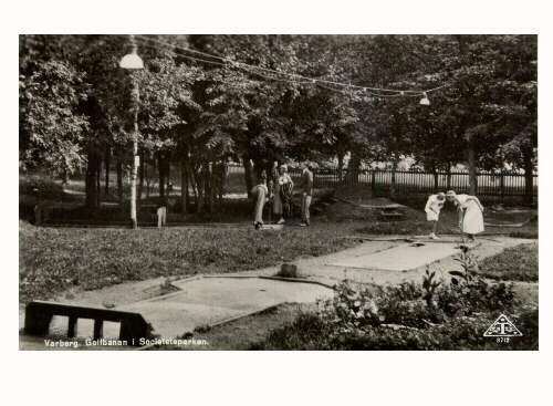 Vykort, "Golfanan i Societetsparken." Här anlades redan 1931 en minigolfbana och idag räknas därmed bangolfen i parken som en av Sveriges äldsta. Minigolfen har rötter i St. Andrews, Scotland, där "Ladies’ Putting Club" anlades 1867, med kortare golfbanor. Men det var i USA som detta nöje senare utvecklades och under 1920-talet sköt fart. När "Tom Thumb Golf" 1926 anlades i Lookout Mountain, Tennessee USA, blev de trendsättande med sina olika former av uppbyggda hinder på banorna. Denna inspiration ses tydligt på den ena minigolfbanan i Societetsparken än idag, på samma plats som den första.