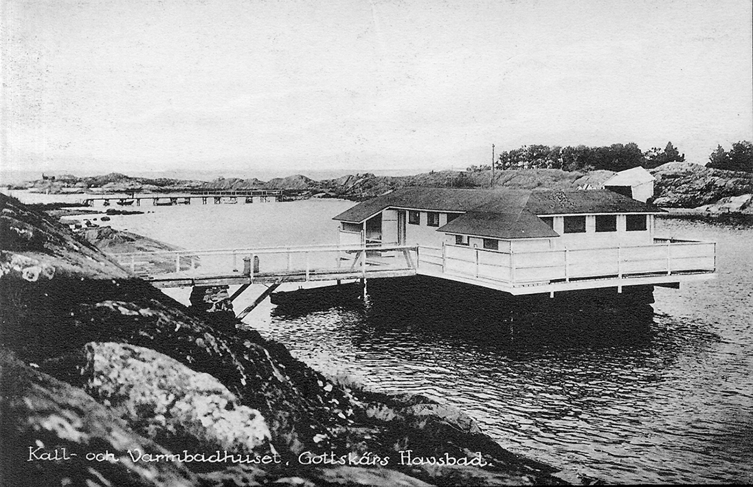 Vykort, "Kall- och varmbadhuset. Gottskärs Havsbad." Bortom detta syns bron över till Utholmen från 1880-talet.