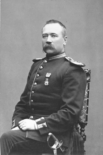Ateljéfoto, sittande man i uniform med värja. Beställare och person på bilden är förmodligen Lundbeck från Uddevalla.