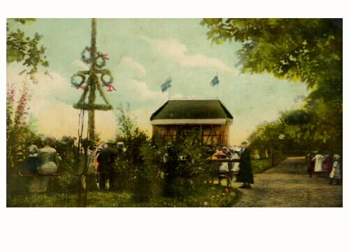 Midsommarfirande på Gamla Påskberget med flera kransar på midsommarstången. Serveringspaviljongen på bilden användes under Lantbruks- och Industriutställningen 1904 i Varberg på Gamlebygärdet och placerades efteråt på Påskberget.