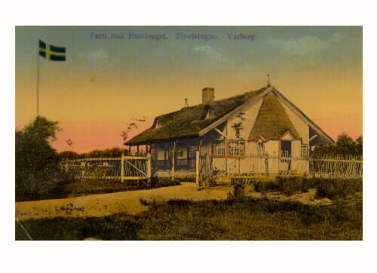 Vykort, "Parti från Påskberget. Tivedstugan. Varberg." Serveringsbyggnaden stod på Nya Påskberget. Den blev sedermera scoutstuga men finns inte kvar idag.