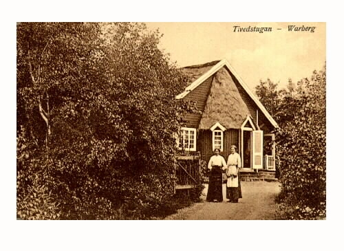 Vykort, "Tivedstugan - Warberg." Två kvinnor står vid grinden in till Tivedstugan i Påskbergsskogen. Där inrymdes både vaktmästarbostad och servering. Dörren står öppen på gavelns ovanliga "absid" med någon form av stråtäckning på taket. Byggnaden lär vara ritad av byggnadsingenjör Gottfrid Ljunggren, arkitekt bakom många byggnader i Varberg 1903-1914.