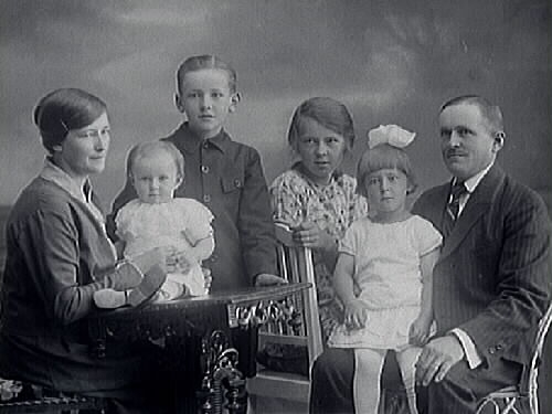 Trävaruhandlare Gottfrid Andersson med familj, hustrun Teresia f. Johansson och fyra barn: Harriet Anna Terese som sitter på bordet, Sven Gösta Gottfrid, äldsta dottern Signe Vera Alica och Ingrid Margareta i faderns knä. Gottfrid var delägare i Varbergs Träförädling, grundad 1933, tillsammans med fabrikör Karl J. Nilsson och grosshandlare Noak Johansson.