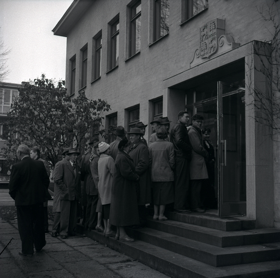 En grupp med människor utanför stads- och tingshuset i Borgholm. Bilder tagna i samband med ölandsbränderna. Göran Johansson blev i tingsrätten dömd som skyldig men friades i hovrätten.