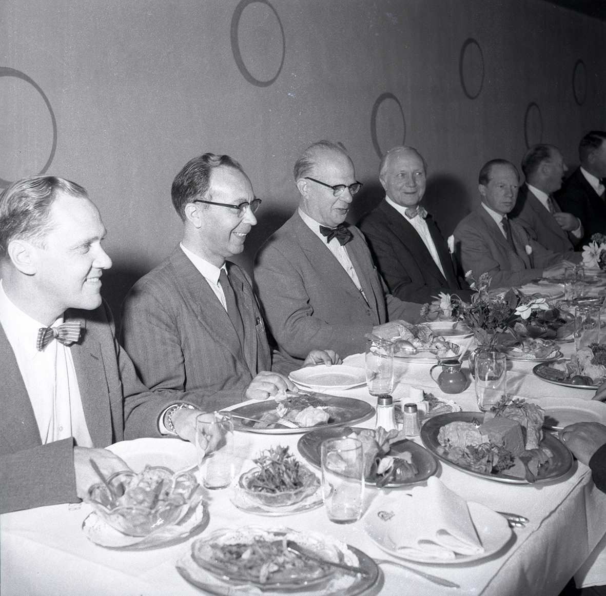 Vid ett dukat middagsbord. Ruben Wagnsson i mitten. Statsrådet Eliasson tredje från höger.