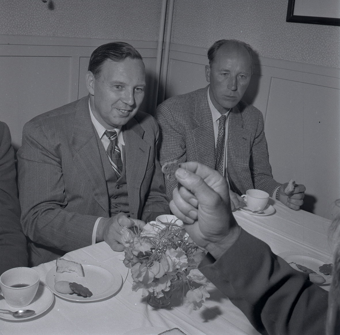 Personer ifrån SAPs partikongress, sept -57 som har kaffepaus. Angående tjänstepension ATP.