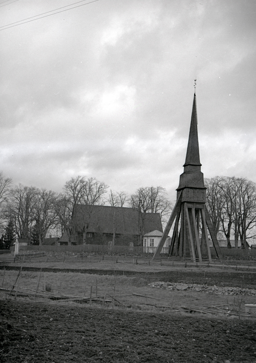 En klockstapel, kyrkogård och kyrka. Pelarne kyrka.
