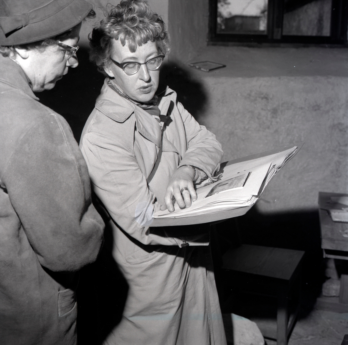 Renovering av Källa ödekyrka. Ragnhild Boström håller pärmen.