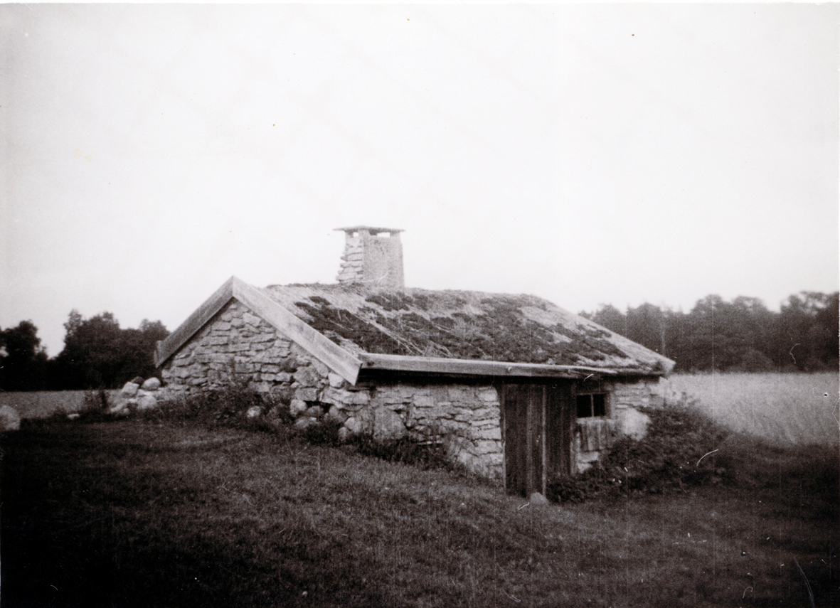 Backstuga i Halleböle. Stugan är delvis nersänkt i jorden. Den har torvtak och är möjligen en ryggåsstuga. Svårt att se skorstenens placering på bilden.