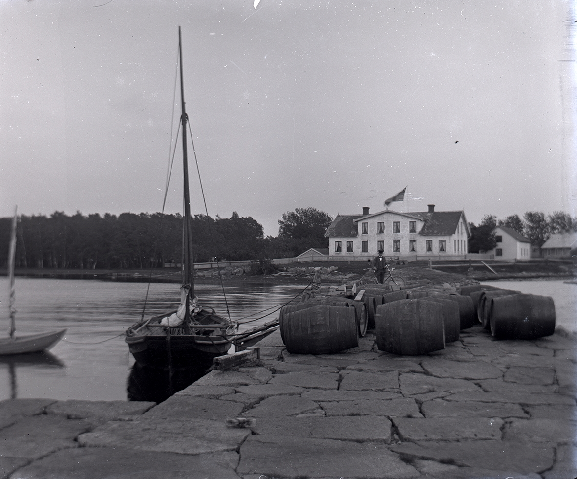 Ett lass med tunnor vid en brygga, troligen vid oskarshamnskusten.