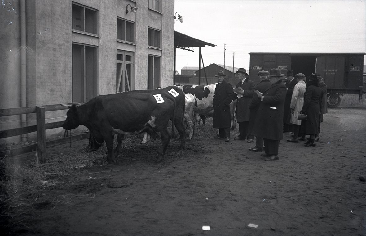 Nötkreatur och människor vid ett slakteri. Slakteribolagets transport i bakgrunden. Ur Walter Olsons negativsamling.