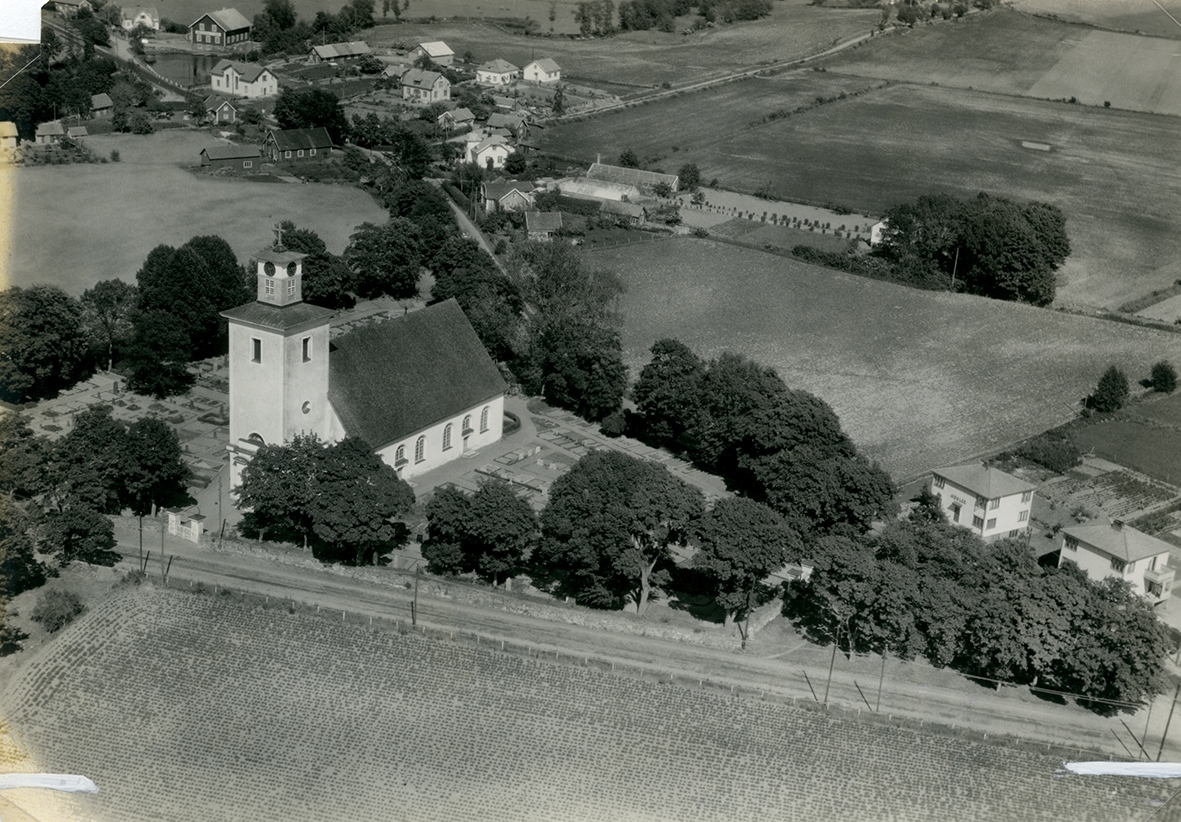 Flygfoto över kyrkan i Rockneby. Bilden visas obeskuren och beskuren till vykort.