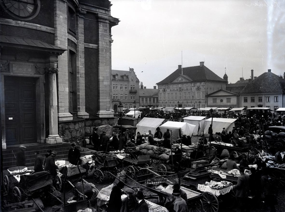 Torghandel på Stortorget i Kalmar. Närmast kameran saluförs kött som besiktigats i köttbesiktningsbyrån i byggnaden till höger om rådhuset i bakgrunden.