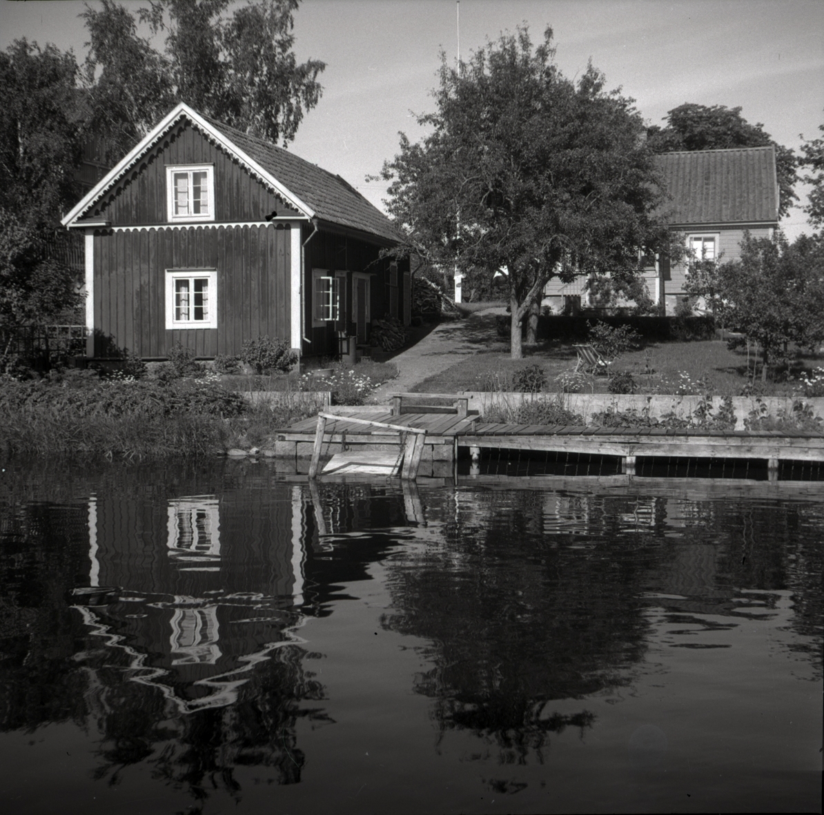 En bod och bostadshus med vatten och brygga i Figeholm.