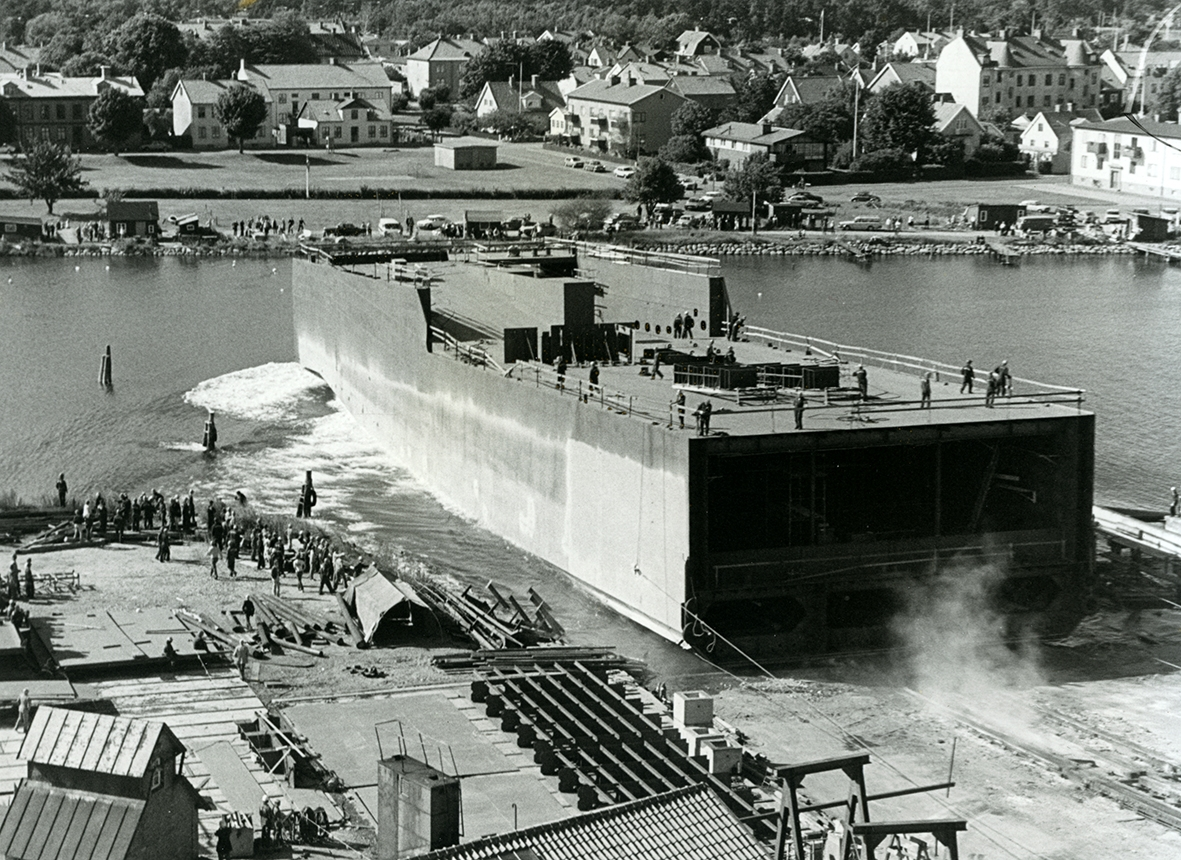 Sjösättning. Fartyg som byggdes i delar på Kalmar varv. Ett annat varv byggde "bakdelen".