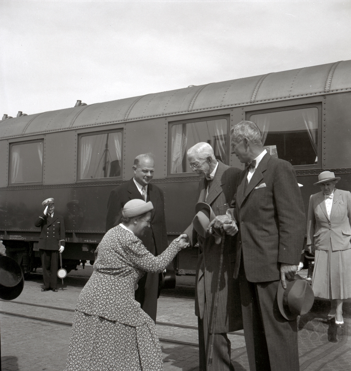 Gustaf V, stödd på borgmästare Yngve Malmqvist, hälsar på landshövdingefrun Wagnsson framför en tågvagn.