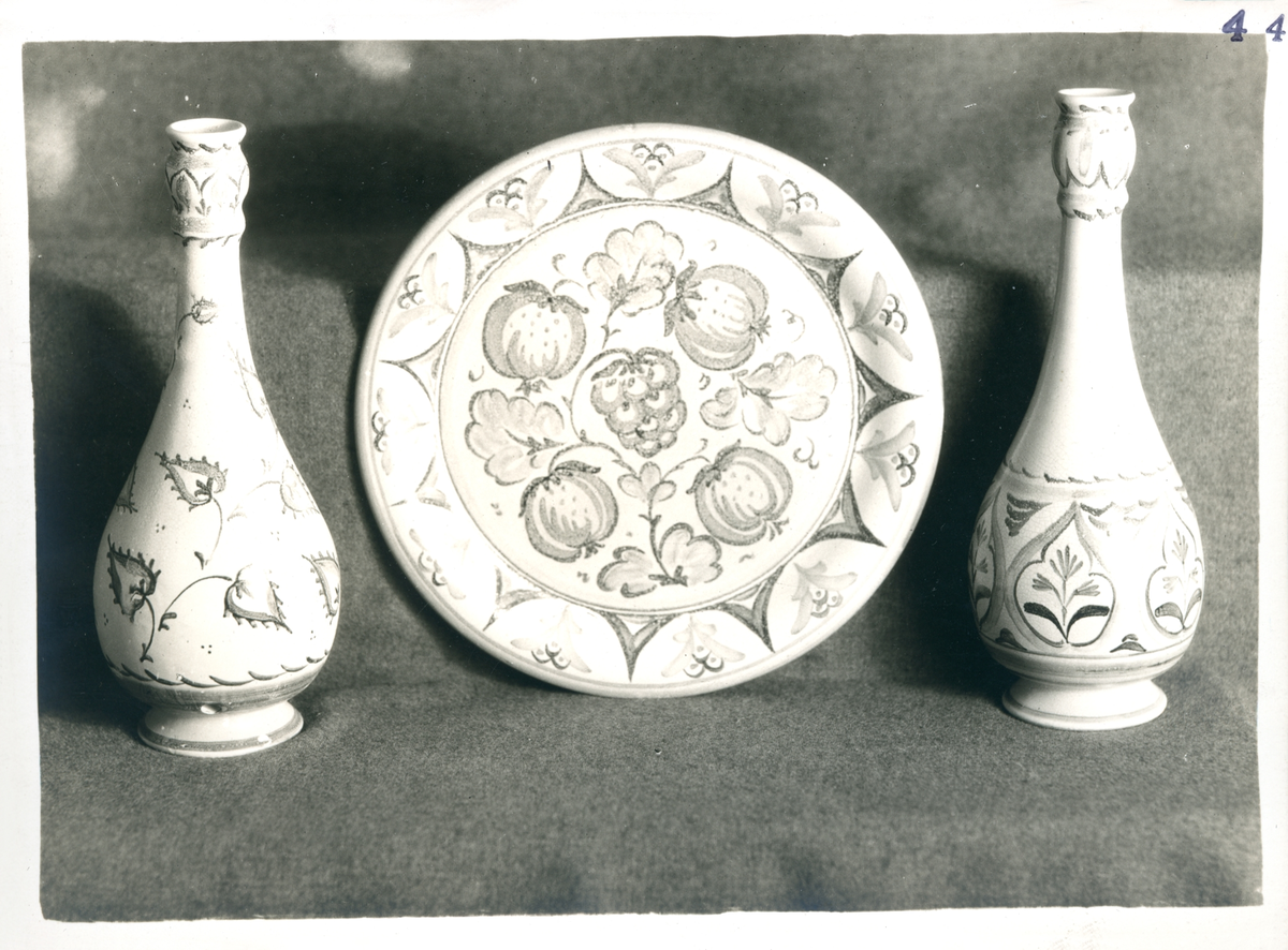 Två långsmala vaser och ett stort fat från Bo Fajans, tidigt 1900-tal.
