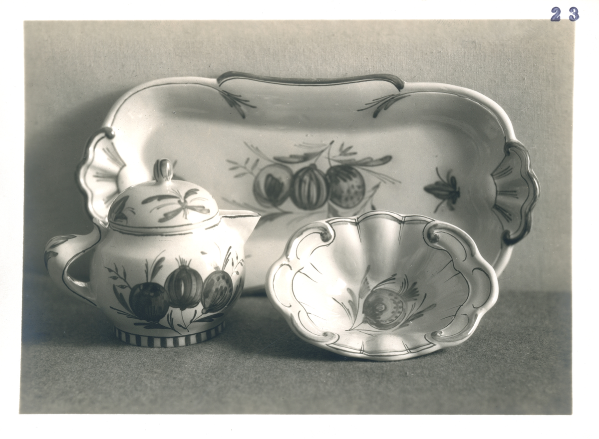 Uppläggningsfat, skål med lock samt liten skål från Bo Fajans, tidigt 1900-tal.