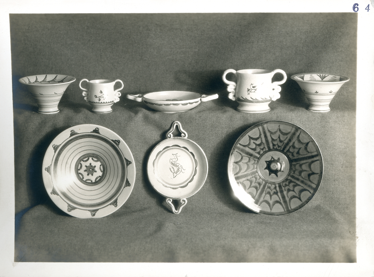 Två skålar, två mindre cigarettbägare med handtag, två mindre askfat med handtag samt två större fat från Bo Fajans, tidigt 1900-tal.