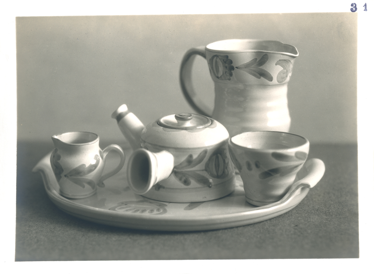 Tekanna med en liten mugg, liten mjölk-/gräddkanna, en stor tillbringare samt tillhörande serveringsbricka från Bo Fajans, tidigt 1900-tal.
