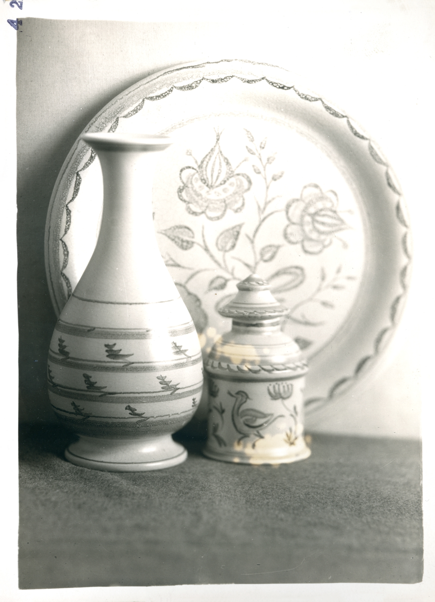 Ett uppläggningsfat, en långsmal vas och en liten skål med lock från Bo Fajans, formgivare Eva Jancke-Björk tidigt 1900-tal.